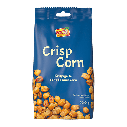 Små, spröda och krispigt rostade majskorn som saltats varsamt. Knaprigt och gott till drinken!
