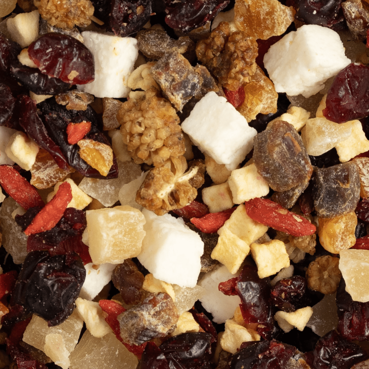 INGREDIENSER: Socker, kokoskuber (13%) (kokos, VETEstärkelse, glukos-fruktossirap, socker, druvsocker, gelatin (nöt)), dadlar (12%), mullbär (12%), aprikos (11%), ananas (10%), tranbär (6,5%), gojibär (6%), äpple (6%), rismjöl, solrosolja, surhetsreglerande medel (citronsyra), konserveringsmedel (svaveldioxid, natriumdiSULFIT).