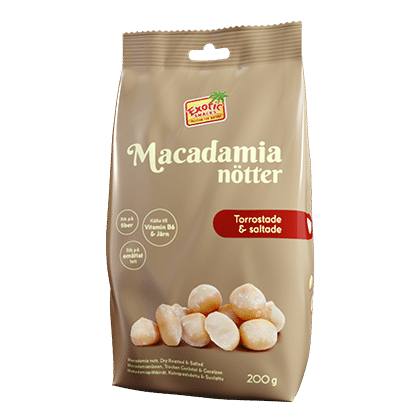 Torrostade och saltade macadamianötter att lyxa med som snacks, i matlagning eller använda topping i sallader och till bakning. Macadamianöten har många användningsområden tack vare att den har en mild, smörig och lätt söt smak. Macadamianötter är en riktig god nöt och dessutom rika på enkelomättat fett och fiber.