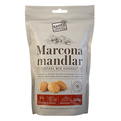Spaniens stolthet, drottningen av mandlar! Våra Marcona-mandlar är rostade och smaksatta med havssalt och har en elegant och milt nötig smak.
